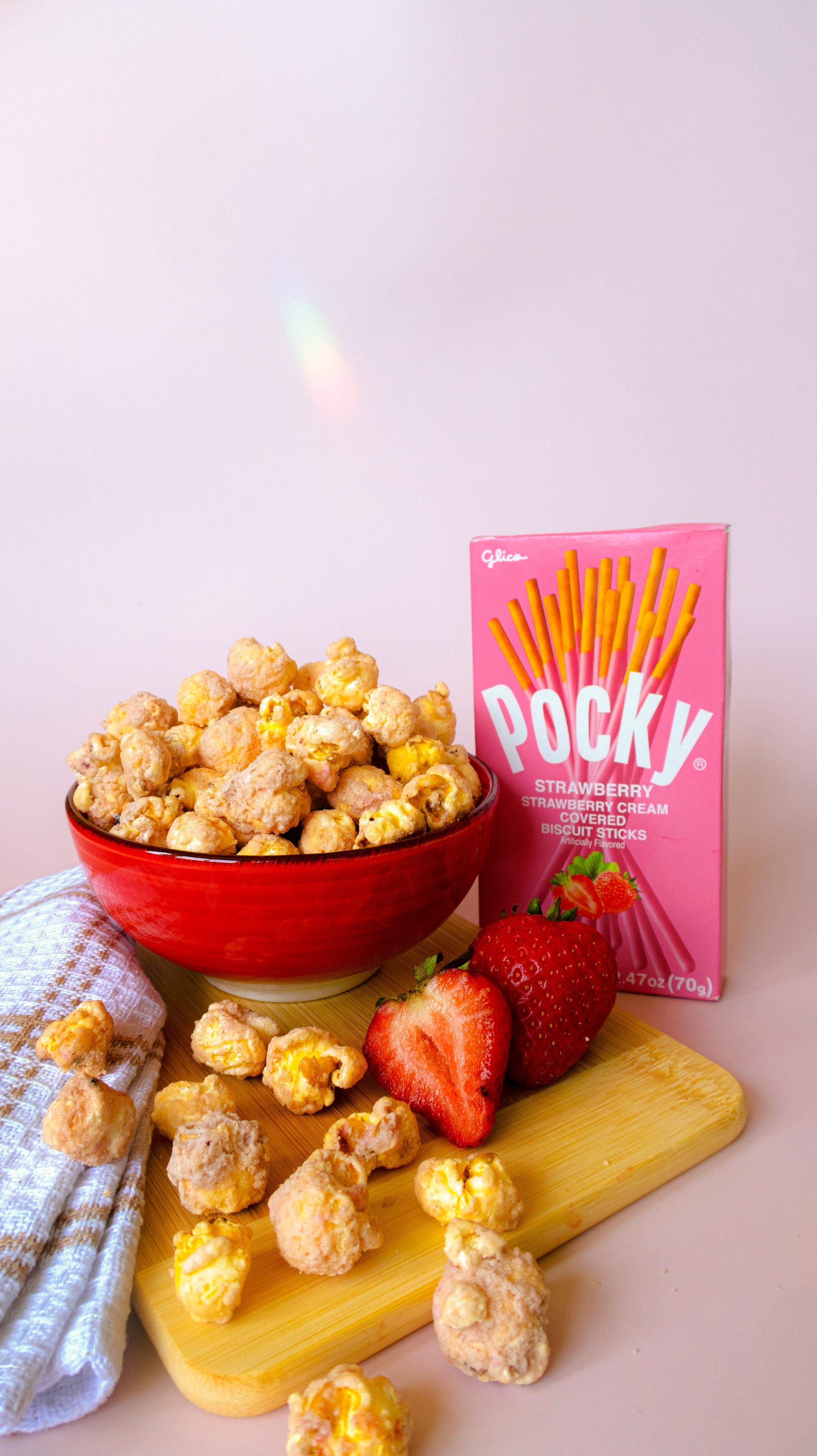 Indulge in our Strawberries and Cream popcorn, a perfect blend of fruity freshness and velvety smoothness that takes snacking to the next level.